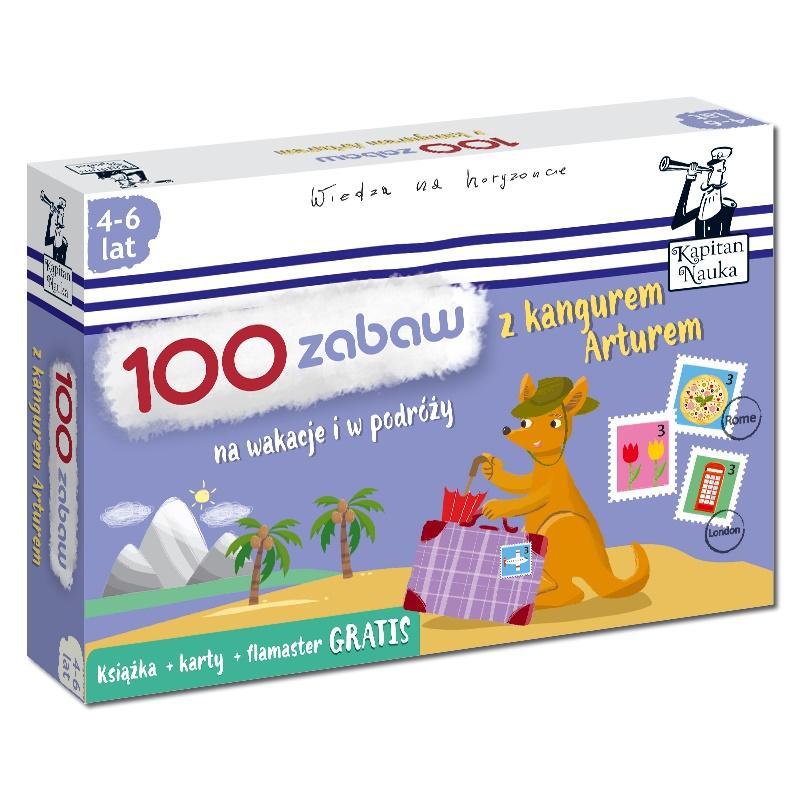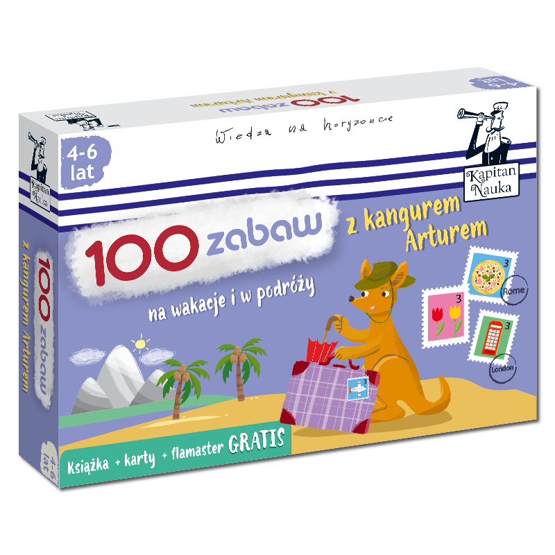 Kapitan Nauka zaprasza na podróż dookoła świata! Podczas zabawy z kartami i książką przedszkolaki pomogą odnaleźć zgubiony bagaż, spróbują narodowych potraw w Japonii i we Włoszech, kupią pamiątki z podróży, wyruszą na wycieczkę na biwak, do lasu i na plażę! Przed nimi 100 zadań dopasowanych do umiejętności każdego małego podróżnika.