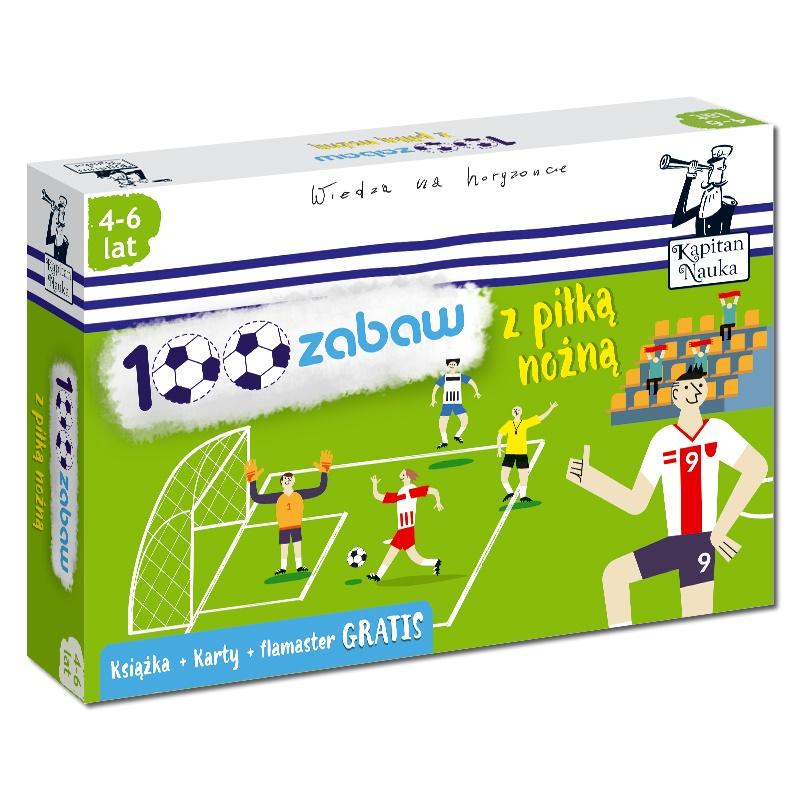 Kapitan Nauka zaprasza na trening piłki nożnej! Podczas zabawy z kartami i książką przedszkolaki wcielą się między innymi w postać trenera, kibica czy piłkarza. Zaprojektują szalik, namalują linie na murawie, poprowadzą piłkarską rozgrzewkę, przeanalizują mecz i nie tylko! Przed nimi 100 zadań, dopasowanych do umiejętności każdego małego fana piłki nożnej.