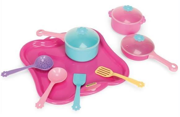 Praktyczna taca, na niej garnek, rondelek, patelnia z pokrywkami i oczywiście sztućce do nakładania posiłków. Produkty wykonane z wysokiej jakości tworzywa sztucznego są bezpieczne przy kontakcie z żywnością. Naczynia można używać w zmywarce i mikrofalówce.