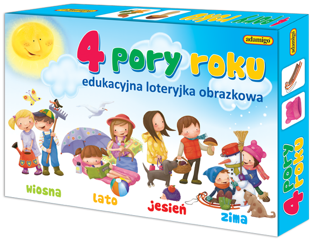 Loteryjka edukacyjna zawiera 3 gry, uczy spostrzegawczości, analizowania obrazu i kojarzenia sytuacyjnego. Piękne ilustracje zachęcają do opowiadania: co takiego, o tej porze roku, robią dzieci na obrazku. Gra zawiera 4 dwustronne plansze, 35 tafelków oraz instrukcję gier.