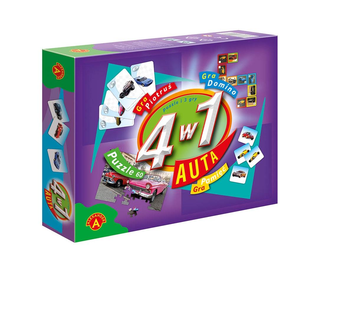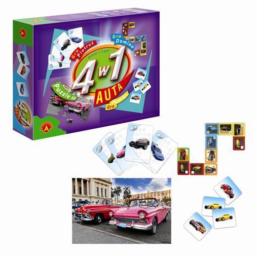 4 w 1 - auta"" to zestaw 3 różnych gier i 60 puzzli do układania.Wszystkie gry i puzzle łączy wspólny temat- samochody. Charakter gier jest zróżnicowany. Prosta gra w karty "" Piotruś"" wzbudzi największe zainteresowanie u najmłodszych. Gra ""Pamięć"" to dobry trening pamięci dla każdego. ""Domino"" jest również uniwersalne, grają w nie chętnie dorosli i dzieci.Puzzle, to świetne ćwiczenie spostrzegawczości, cierpliwości i skupienia.
