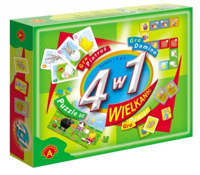 4 w 1 - Wielkanoc to zestaw 3 gier i puzzle do układania złożone z 60 elementów.