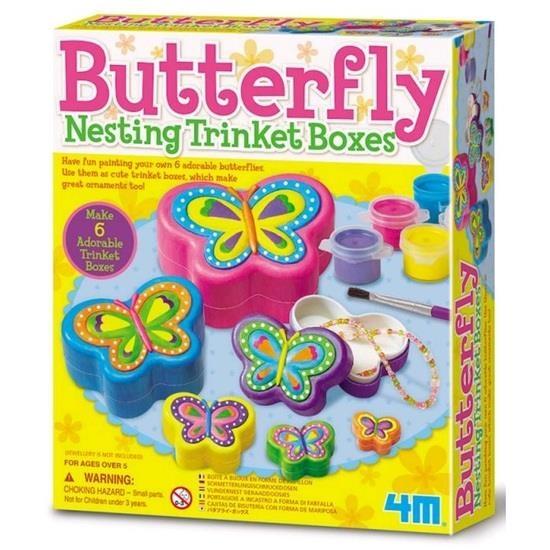 Baw się malują 6 uroczych motyli, a nastęonie użyj ich jako ozdobne pudełka do przechowywania drobiazgów! Zawartość: 6 ozdobnych puzderek z motylkami 1 pasek z 6 farbami pędzelek szczegółowa instrukcja