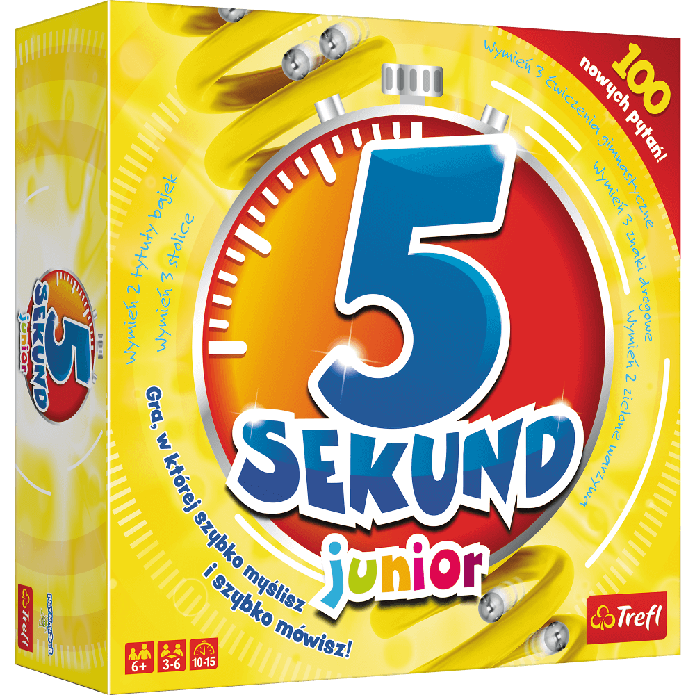 Z pewnością bez trudu jesteś w stanie wymienić 3 smaki dżemu - ale czy dasz radę zrobić to pod presją czasu? Masz 5 sekund, a pozostali gracze tylko czekają na Twoje potknięcie! Czas nie jest Twoim sprzymierzeńcem, dlatego mówisz co ci ślina na język przyniesie. Podajesz czasem dziwaczne, czasem śmieszne odpowiedzi, podczas gdy kulki szybko mkną w dół spirali specjalnego czasomierza. Jeśli pytanie sprawia ci kłopot - wykorzystujesz karty "Czasu" lub "Zmiany". Na żółtej stronie kart znajdują się pytania dla młodszych dzieci, a na czerwonej dla starszych. 5 sekund - szalona i zabawna gra teraz w wersji junior!