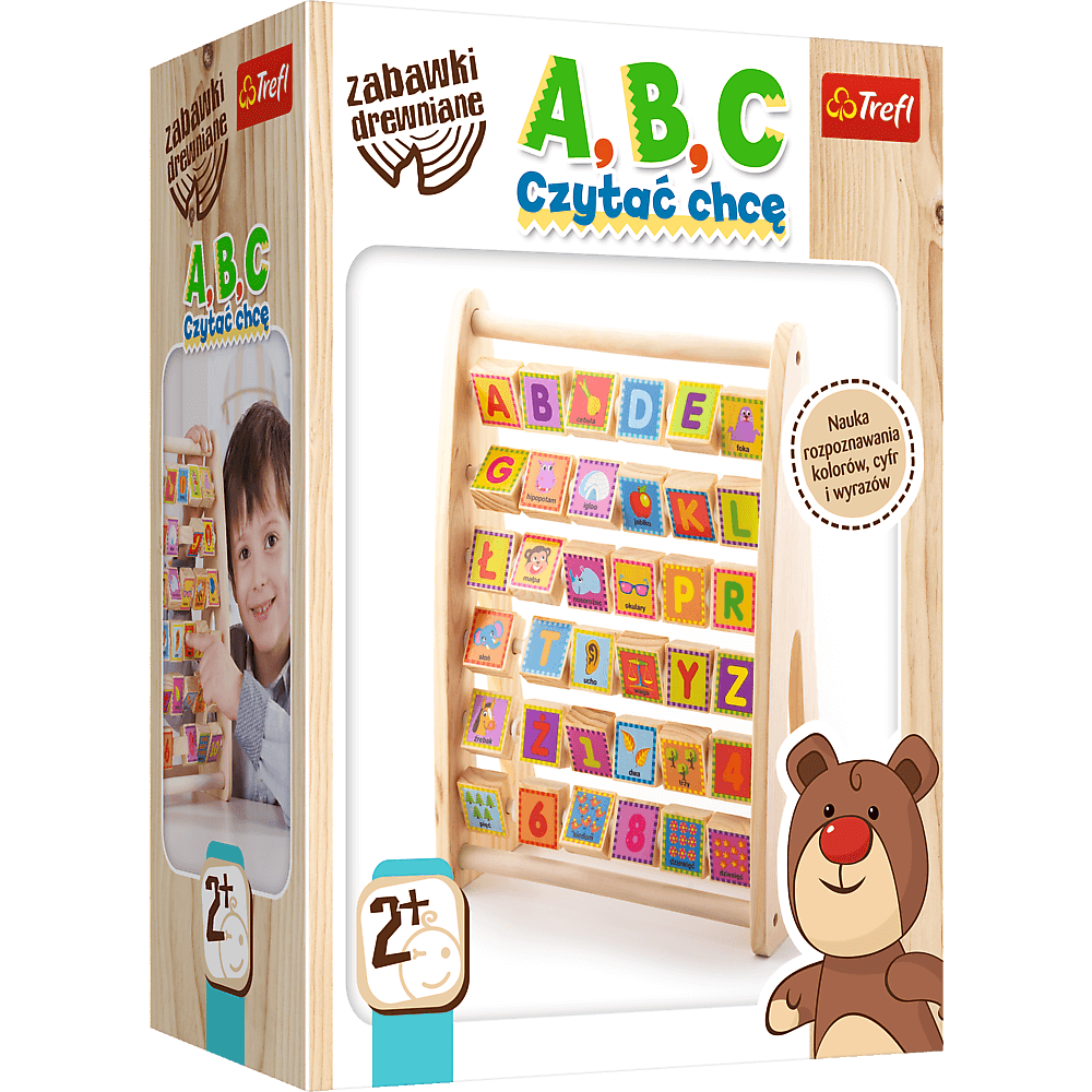 A, B, C Czytać Chcę to dwustronne klocki, na których po jednej stronie znajdują się cyfry i litery, a po drugiej korespondujące z nimi kolorowe obrazki i słowa
