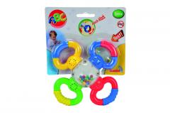 Plastikowa grzechotka z przezroczystym środkiem wypełnionym kolorowymi kuleczkami. Cztery kolorowe pokrętełka mogą służyć do zabawy, mogą także być gryzaczkami. Zabawka jest przeznaczona dla dzieci od 3 miesiąca życia.