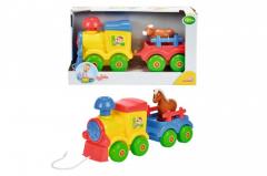 W zestawie pociąg ze sznureczkiem do ciągnięcia oraz przyczepka dla konia wraz z figurką konika.