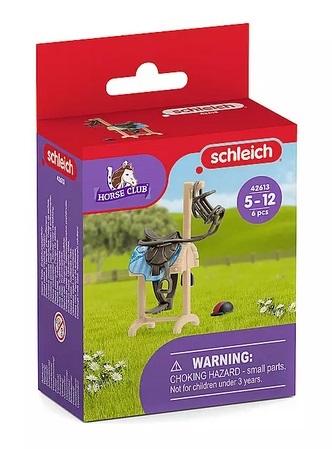 Derka dla konia i siodło doskonale mieszczą się na stojaku. Możesz tu również powiesić uzdy, znajdzie się nawet miejsce na czapkę jeździecką. Miej wszystko w jednym miejscu — to idealne uzupełnienie dostępnego oddzielnie transportera dla koni z serii schleich HORSE CLUB.