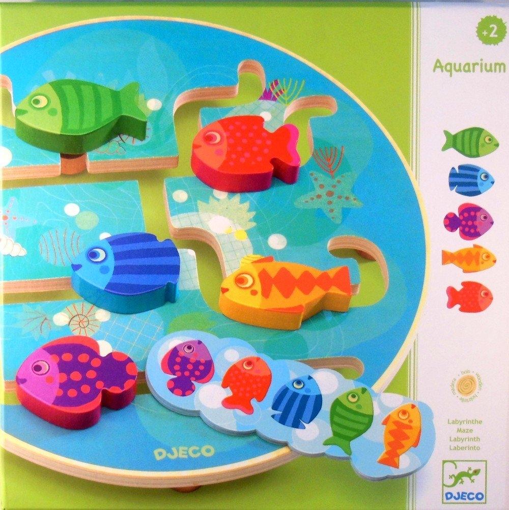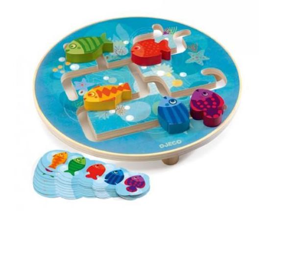 Drewniany labirynt - akwarium, po którym dziecko porusza kolorowymi rybami w wydrążonych rowkach. Walory edukacyjne: rozwój małej motoryki ręki, koordynacja oko-ręka, koncentracji, precyzji, wyobrażni, odwzorowywania, logicznego myślenia
