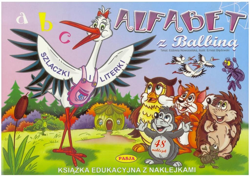 Książka edukacyjna z naklejkami. Opowiadanie o przygodach bocianicy Balbiny plus ćwiczenia w pisaniu szlaczków i alfabetu.
