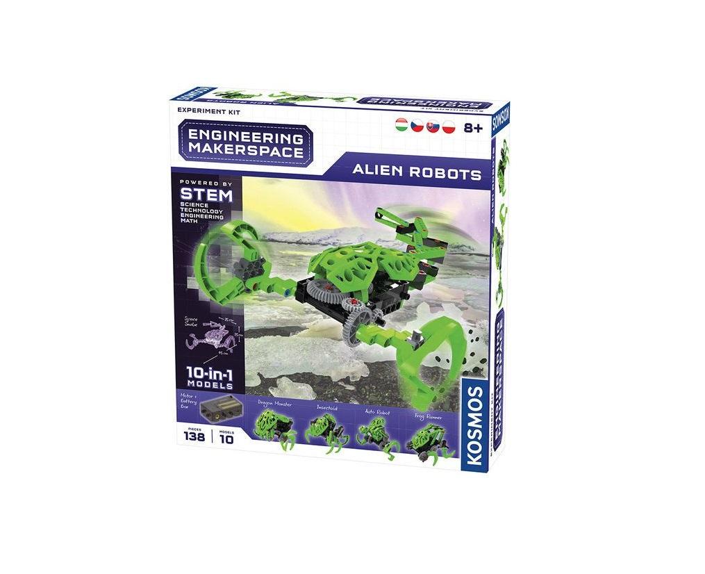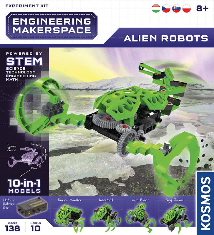 Zbuduj dziesięć kosmicznych maszyn i poznaj zasady dźwigni i przekładni. Silnik zasilany z akumulatora zasila modele. Zbuduj przerażającego stwora z obrotowymi ramionami i przegubowym ogonem. Stwórz robota, który porusza się na sześciu nogach. Stwórz raptora ze skrzydłami poruszanymi w górę i w dół.Wykorzystując mechanizm nożycowy, złóż zwinny pazur chwytakowy. Ponadto, zbuduj modele typu pumpjack, urządzenie wahadłowe, skaczący robot-żabę, wędrującego dino-bota z ramieniem posuwisto-zwrotnym i toczącego się kosmicznego smoka. Wehukuły wyposażone są w silniki elektryczne zasilane bateriami AAA. 28-stronicowa instrukcja poprowadzi Twoją budowę modelu i eksperymenty z ilustrowanymi instrukcjami krok po kroku.