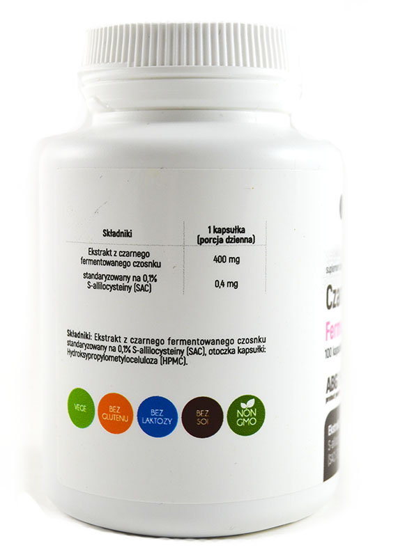 Ekstrakt z czarnego fermentowanego czosnku standaryzowany na 0,1% S-allilocysteiny (SAC), otoczka kapsułki: (substancja wiążąca: hydroksypropylometyloceluloza).