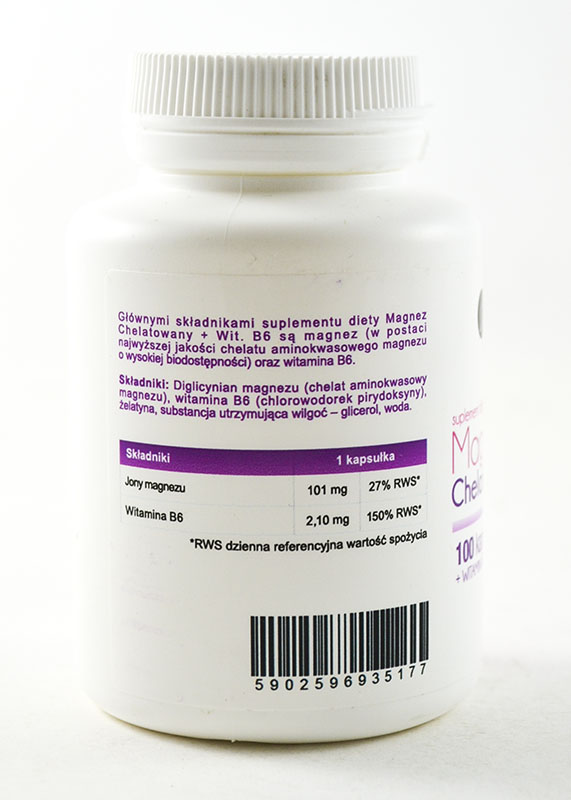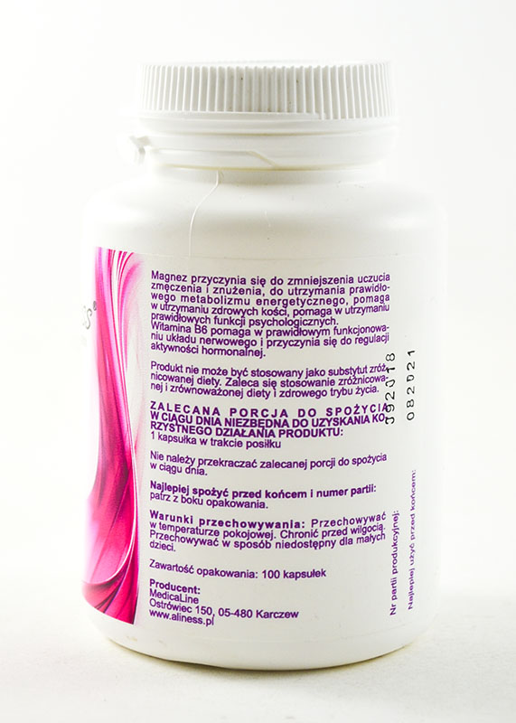 Głównymi składnikami suplementu diety Magnez Chelatowany 560 mg + Wit. B6 są magnez (w postaci najwyższej jakości chelatu aminokwasowego magnezu o wysokiej biodostępności) oraz witamina B6. Magnez chelatowany Aliness to innowacyjny produkt na rynku w postaci wysokiej jakości diglicynianu magnezu oraz wyłącznie witaminy B6. Nie używamy w nim dodatków technologicznych, barwników itp.