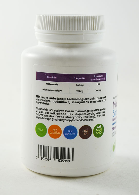 Sól sodowa kwasu masłowego (maślan sodu) w postaci mikrokapsułek dojelitowych, otoczka mikrokapsułek (kwas stearynowy roślinny), otoczka kapsułki vege (hydroksypropylometyloceluloza).