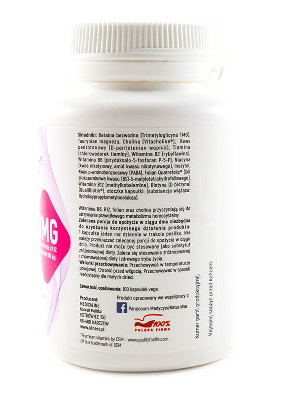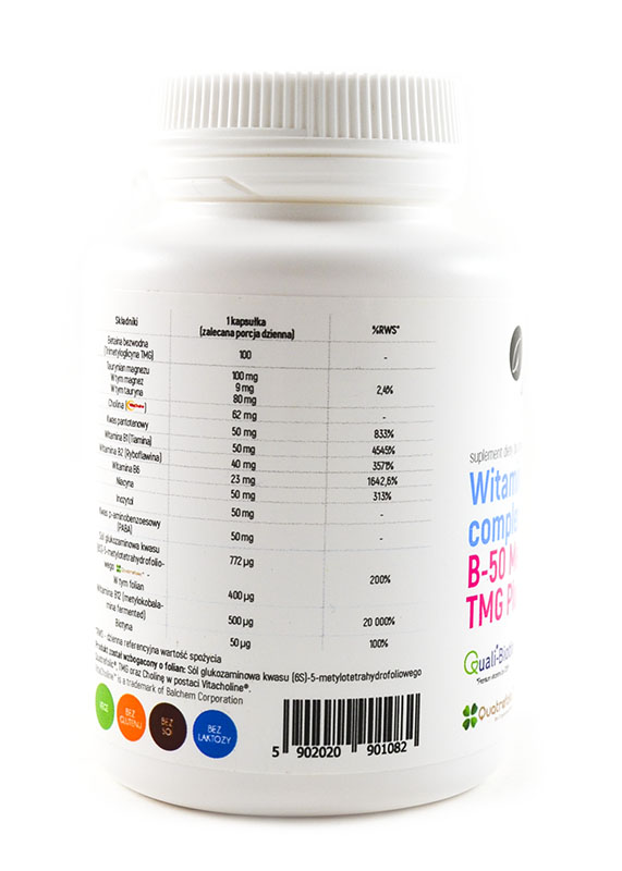 Betaina bezwodna (Trimetyloglicyna TMG), Taurynian magnezu, Cholina (Vitacholine®), Kwas pantotenowy (D-pantotenian wapnia), Tiamina (chlorowodorek tiaminy), Witamina B2 (ryboflawina), Witamina B6 (pirydoksalo-5-fosforan P-5-P), Niacyna (kwas nikotynowy, amid kwasu nikotynowego), Inozytol, Kwas p-aminobenzoesowy (PABA), Folian Quatrefolic® (Sól glukozaminowa kwasu (6S)-5-metylotetrahydrofoliowego), Witamina B12 (methylkobalamina), Biotyna (D-biotyna) (QualiBiotin®), otoczka kapsułki: (substancja wiążąca: Hydroksypropylometyloceluloza).