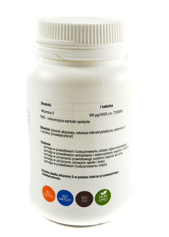 Wysoka dawka witaminy D w postaci dobrze przyswajalnego cholekalcyferolu.
