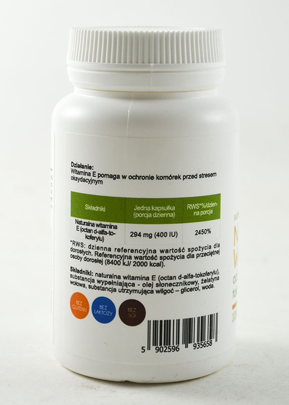 Naturalna witamina E (octan d-alfa-tokoferylu), substancja wypełniająca - olej słonecznikowy, żelatyna wołowa, substancja utrzymująca wilgoć – glicerol, woda.