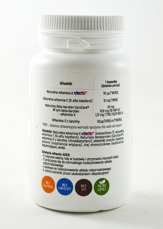 Naturalna witamina K VitaMk7 (VitaMK7® menachinon-7), naturalna witamina E (D-alfa tokoferol), Naturlany Betakaroten (CaroCare®), witamina D z lanoliny (cholekalcyferol), składniki otoczki: żelatyna, glicerol (substancja wiążąca), olej słonecznikowy (substancja wypełniająca), woda.