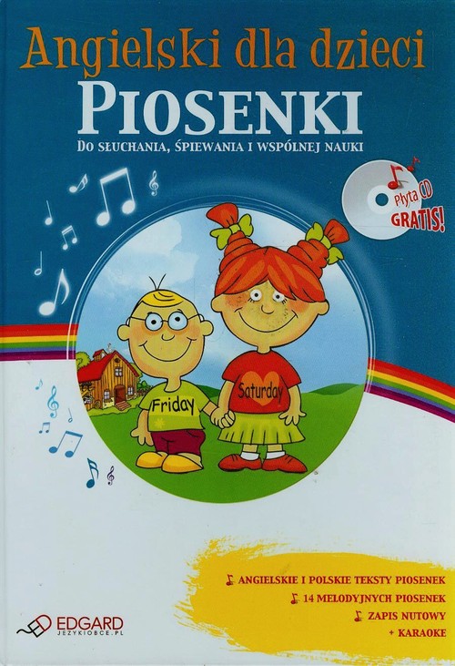 Do słuchania, śpiewania i wspólnej nauki Piosenki Piosenki są wyjątkowym pakietem (książka + płyta CD), który uczy dzieci języka angielskiego przez śpiew i zabawę. 14 melodyjnych, łatwo wpadających w ucho piosenek w wykonaniu 7-letniej Brytyjki nie tylko zapoznaje z nowym słownictwem, lecz także doskonali rozumienie ze słuchu oraz wymowę. Kolorowe ilustracje ułatwiają zapamiętanie tekstów. W książce znajduje się polskie tłumaczenie oraz zapis nutowy, który idealnie nadaje się do wykorzystania w trakcie zabaw muzyczno-ruchowych, wspólnej gry, śpiewu i tańca. Zamieszczone dodatkowo na płycie wersje karaoke doskonale sprawdzają się zarówno podczas wspólnego słuchania, jak i podróży samochodem. Zabawne ilustacje angielskie i polskie teksty piosenek zapis nutowy 14 melodyjnych piosenek.