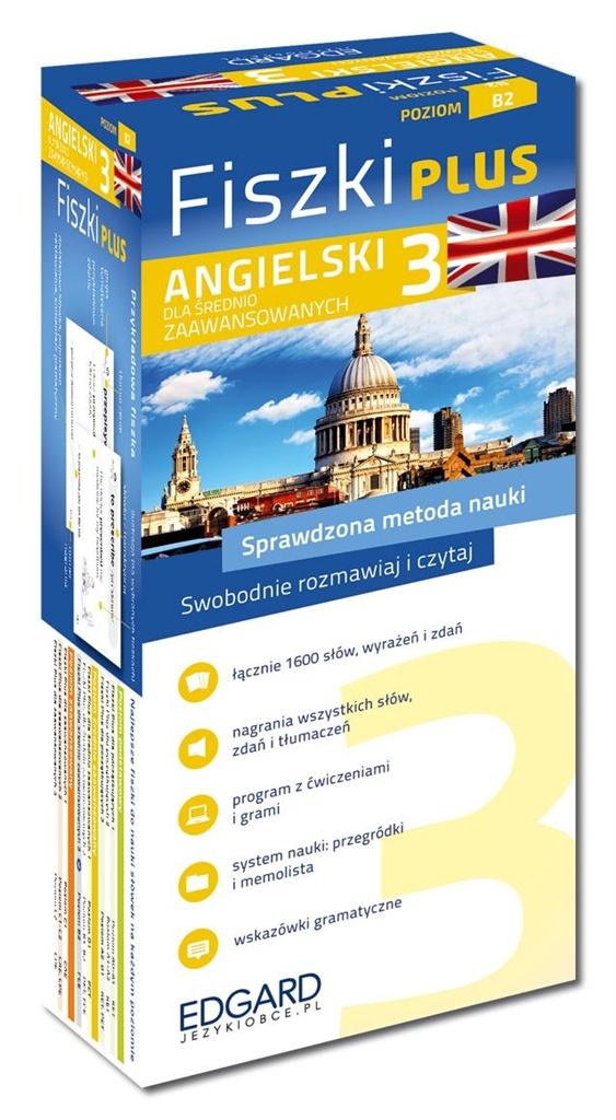 600 fiszek + program i nagrania do pobrania + kolorowe przegródki + etuiAngielski Fiszki PLUS dla średnio zaawansowanych 3 (B1) to pakiet będący częścią rozbudowanego systemu nauki, dzięki któremu szybko i skutecznie nauczysz się słownictwa na każdym poziomie zaawansowania. Każdy zestaw Fiszek PLUS to starannie przygotowany materiał, wysokiej jakości nagrania wymowy wraz z programem komputerowym, memolistą i grami językowymi.Z Fiszkami PLUS nie tylko zapamiętujesz słówka, lecz także poznajesz słownictwo w kontekście, uczysz się nieregularnych form oraz popularnych zwrotów językowych. Od dziś nauka języka stanie się przyjemnością!- Ucz się 1500 słów, wyrażeń i zdań poznaj użycie gotowe wzorce komunikacyjne, utrwal reguły gramatyczne.- Poznaj prawidłowa wymowę. Słuchaj nagrań wszystkich słówek i zdań oraz ich tłumaczeń- Utrwalaj materiał z ćwiczeniami i grami językowymi dostępnymi w programie (do pobrania)- Ucz się skutecznie dzięki systemowi kolorowych przegródek. Sprawdź na memoliście, które słówka już znasz!- Twórz własne playlisty nagrań wymowy i ucz się mobilnie w drodze do pracy lub szkoły!