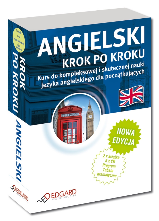 ANGIELSKI Krok po kroku NOWA EDYCJA: - 6 godzin wysokiej jakości nagrań na 5 płytach CD - tylko rodowici Brytyjczycy,- 3000 niezbędnych słów i zwrotów,- współczesne dialogi i praktyczne wyrażenia z tłumaczeniami,- program multimedialny,- przystępnie objaśniona gramatyka,- ćwiczenia z odpowiedziami,- tabele gramatyczne- różnorodne ciekawostki. ANGIELSKI Krok po kroku NOWA EDYCJA to kurs do kompleksowej nauki języka angielskiego od poziomu początkującego do średnio zaawansowanego (A1-B1). Polecany jest osobom zaczynającym naukę oraz wszystkim, którzy chcą doskonalić językowe umiejętności, poszerzyć zasób słownictwa oraz poprawić wymowę.Kurs uczy 3000 słów i zwrotów niezbędnych na co dzień, przystępnie objaśnia i utrwala najważniejsze zasady gramatyczne oraz uczy prowadzenia swobodnych rozmów z obcokrajowcami i rozumienia ze słuchu. Różnorodne ciekawostki urozmaicają naukę i zapoznają z obyczajami oraz kulturą Wielkiej Brytanii. Książki (łącznie 256 str.) zawierają zestawy słówek, ciekawe dialogi, interesujące ćwiczenia utrwalające, 30 lekcji tematycznych, dodatkowe sekcje dla ambitnych, pełny zapis nagrań wraz z tłumaczeniami na język polski, ciekawostki, np. o American English, popularnych miejscach na zakupy, five o'clock, narodowych sportach - polo i krykiecie czy o kuchni brytyjskiej. Część gramatyczna przystępnie wyjaśnia najważniejsze zagadnienia, m.in. szyk zdania, czasowniki modalne, zasady tworzenia pytań, zaimki, stopniowanie przymiotników i czasy. Dołączone do zestawu tabele gramatyczne zawierają najważniejsze czasowniki nieregularne oraz czasy gramatyczne.Wysokiej jakości nagrania profesjonalnych lektorów (6 godzin, 5 płyt CD) pozwalają osłuchać się z językiem, poznać jego melodię oraz prawidłową wymowę. Słówka, zwroty oraz dialogi zostały udźwiękowione przez profesjonalnych lektorów. Specjalnie przygotowana szósta płyta zawiera wszystkie nagrania w formacie MP3.Program multimedialny uczy nowych słówek i utrwala zdobytą wiedzę. Zawiera interaktywne ćwiczenia, gry, testy, doskonali umiejętność pisania, rozumienia ze słuchu oraz umożliwia samodzielny i skuteczny trening prawidłowej angielskiej wymowy.Angielski Krok po kroku to unikalna i bardzo skuteczna forma poznawania języka - łączy naukę z podręcznikiem, słuchanie nagrań na płytach audio lub mp3 z pracą z programem komputerowym. Pakiet polecamy do samodzielnej nauki w podróży, w domu, w samochodzie.