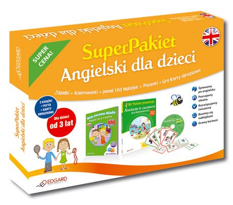 SuperPakiet Angielski dla dzieci od 3 lat (2 x Książka + CD Audio + Karty obrazkowe) Zagadki + Kolorowanki + ponad 100 Naklejek + Piosenki + Gra Karty obrazkowe SuperPakiet Angielski dla dzieci to: - ponad 100 kolorowych naklejek - nauka angielskich słówek - różnorodne zagadki językowe i ćwiczenia - nagrania piosenek po angielsku - ciekawe zabawy z Kartami obrazkowymi - gratis gra planszowa SuperPakiet Angielski dla dzieci to wyjątkowy edukacyjny pakiet dla najmłodszych, który zapewnia aktywną naukę języka przez gry, śpiew i zabawę. Zestaw składa się z dwóch książek, do których dołączono płytę CD z piosenkami w wykonaniu brytyjskich lektorów oraz komplet kolorowych kart obrazkowych. Pakiet został specjalnie przygotowany tak, aby nauka języka była dla dzieci ciekawa i przyjemna. W skład SuperPakietu wchodzą: - Angielski w zagadkach dla przedszkolaka (książka) z 80 zagadkami, ćwiczeniami i rebusami, która zapewnia naukę 500 najważniejszych angielskich słówek. Dodatkowo na końcu książki zamieszczono słowniczek angielsko-polski. - Moje pierwsze słówka dla 4-5-latków (książka) zawierają zestaw ponad 100 kolorowych naklejek. Różnorodne ćwiczenia i zabawy z wykorzystaniem naklejek zapewniają przyjemną naukę angielskich słówek. Dodatkowo gratis na wewnętrznej stronie okładki umieszczono grę planszową. - Piosenki (CD) to płyta z nagraniami popularnych utworów w wykonaniu angielskich lektorów. Śpiewa mała Brytyjka i jej tata. - Karty obrazkowe to kolorowe, zabawnie ilustrowane karty polsko-angielskie, idealne do gier i ciekawych zabaw.