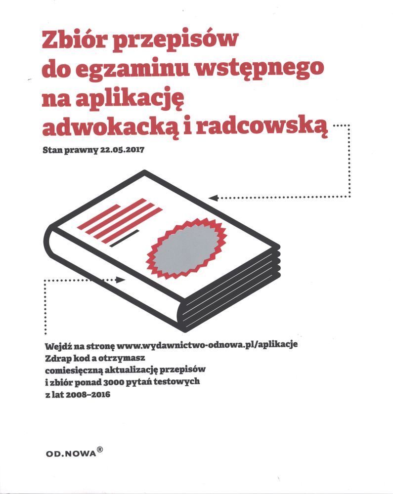 Publikacja stanowi doskonałą pomoc dla przystępujących do egzaminu wstępnego na aplikacje. W jednym miejscu zgromadzone zostały wszystkie potrzebne akty prawne objęte zakresem egzaminu. Stan prawny aktów prawnych: maj 2017 r. Zaletą zbioru jest możliwość pobrania comiesięcznej aktualizacji ze strony www.wydawnictwo-odnowa.pl/aplikacje (wykorzystując zdrapkę umieszczoną na książce). Dzięki temu można co miesiąc pobrać ogłoszone w międzyczasie zmiany do tekstów ustaw. Zapewnia to stałą aktualność książki do dnia egzaminu we wrześniu 2017 r.