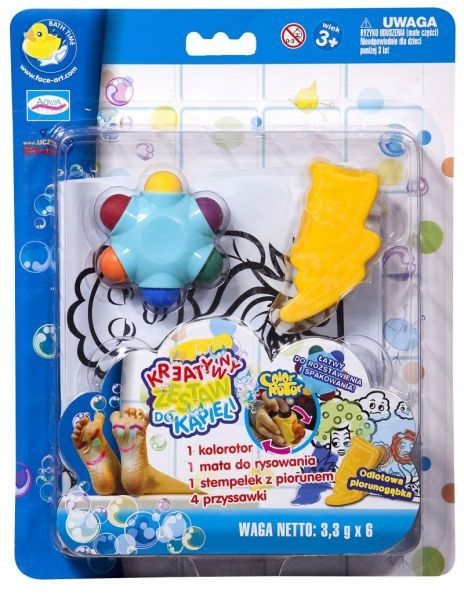 STUDIO AQUA TO SERIA WYJATKOWYCH ZESTAWÓW KREATYWNYCH DO ZABAWY W KĄPIELI. KREDKI , MARKERY I FARBY SĄ BEZPIECZNE I ŁATWO ZMYWALNE.Zestaw zawiera matę z rysunkiem do pokolorowania , gąbkę w plastikowej oprawce do ścierania rysunków i multikolorową kredkę do rysowania w kąpieli.