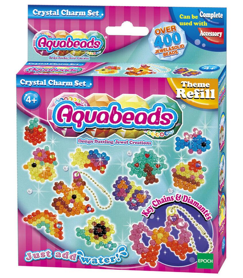 Zaprojektuj olśniewające dzieła z klejnocików, korzystając z zestawu uzupełniającego Kryształowe zawieszki, który zawiera koraliki-diamenciki i naklejki z diamencikami, a także akcesoria do breloczków na klucze i breloczki. Od kokardek po motylki, możesz dodać trochę połysku do swego świata Aquabeads, korzystając z tych uroczych akcesoriów. Olśnij koleżanki i kolegów tym błyszczącym zestawem do prac plastycznych - idealny sposób na pochwalenie się swoimi dziełami. Możesz użyć tego produktu z kompletnymi zestawami, ale również z akcesoriami.