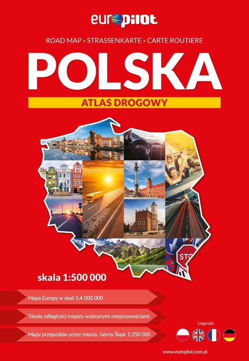 Mapa drogowa Polski skala 1:500 000; ponad 14 000 miejscowości; pełna numeracja dróg; atrakcje turystyczne; tabela odległości; czarne punkty, 22 plany przejazdów przez miasta ; mapa GOP, mapa Europy 1: 4 000 000