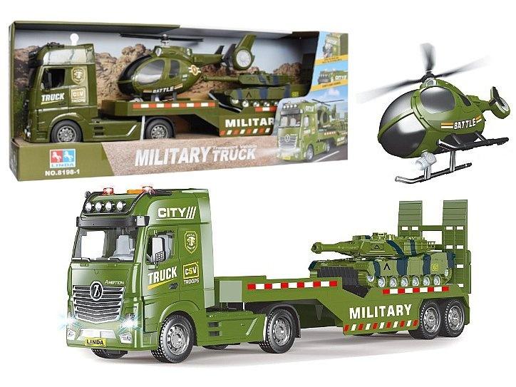 Auto z lawetą i pojazdami wojskowymi, światła, dźwięk; 55x11x17,5cm, W/B