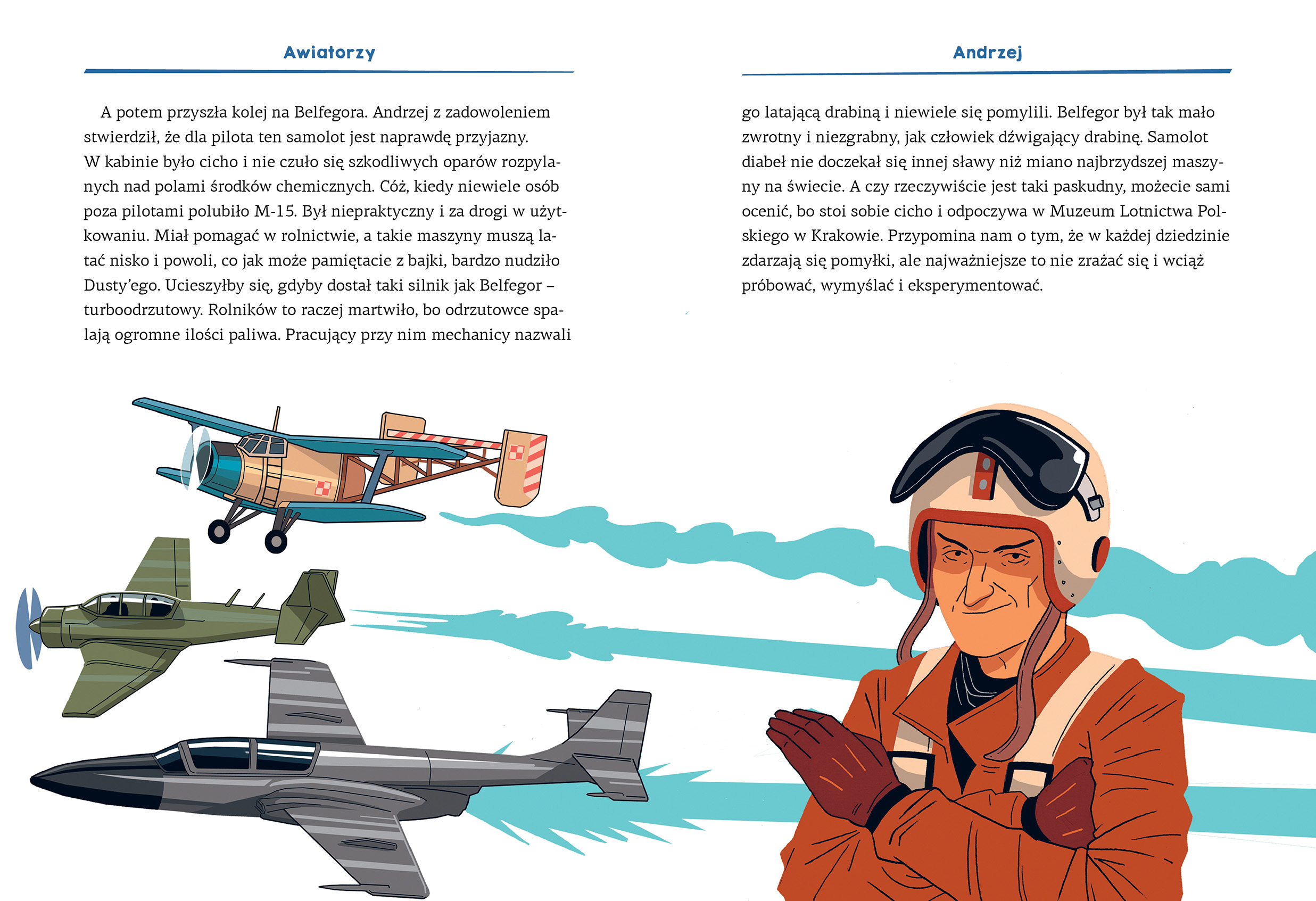 Od dzieciństwa marzyli o podniebnych przygodach, o tym, by siąść za sterami samolotu, wzbić się w powietrze i królować w przestworzach. Poznaj niesamowite historie polskich lotniczek i lotników, poskramiaczy metalowych smoków, pilo-tów oblatywaczy, szybowników, a nawet kosmonautów. Jak długo musiał czekać na poprawę pogody Sebastian Kawa, żeby jako pierwszy (i póki co jedyny) człowiek na świecie przelecieć szybowcem nad Himalajami? Jak wyglądała czekolada, którą Mirek Hermaszewski, jedyny polski kosmonauta, jadł na stacji kosmicznej orbitującej wokół Ziemi? W jakim niecodziennym stroju Stanisław Skarżyński przeleciał samotnie Atlantyk małym turystycznym samolotem (do dziś nikt mniejszym nie pokonał oceanu)? Ile kilometrów musieli przebyć – i ile drużyn pokonać – Żwirko i Wigura w najbardziej wyczerpują-cym rajdzie samolotowym dookoła Europy? Jaki fortel zastosowała Ada Dankowska, najsłynniejsza polska szybowniczka, podczas swojego brawurowego lotu po rekord świata? Marzenia są w zasięgu ręki, a właściwie w zasięgu… skrzydeł! Latać, ale czym? Za każdym lotnikiem stoi – leci! – jego ulubiona maszyna. Samoloty i szybowce mają swoje imiona, często nadawane na cześć konstruktorów, i specjalne podniebne moce, a co najważniejsze: dają się prowadzić tylko wybranym, po prostu najlepszym. Jak okiełznać metalowego smoka MiG-29? Kiedy docisnąć RWD-6, czyli erwudę, żeby przyspieszyć na ostatnich metrach rajdu i wygrać? Jak wprowadzić szybowiec w podniebny taniec… z bocianami i jaskółkami? Dlaczego jedyny na świecie odrzutowy samolot rolniczy dostał imię demona Belfegora? Kolorowe ilustracje, na których wiernie zostały pokazane samoloty, szybowce z różnych czasów, a nawet rakiety kosmiczne, będą nie lada gratką dla przyszłych konstruktorów. A co o swoich przygodach mówią sami bohaterowie? „W lotnictwie kocham to uczucie oderwania od przyziemnego bałaganu. Z góry wszystko wygląda jak piękny malunek. Na dole jest szaro, deszczowo, a ja odrywam się i wychodzę ponad chmury, w słońce i błękit nieba”. Paulina Różyło-Nowicka, pilot oblatywacz „Szybownictwo to piękny sport, dla wnuków i dla dziadków. Można zacząć naprawdę wcześnie i latać bardzo długo, całe życie. To moja pasja, podobnie jak zdobywanie rekordów i wyznaczanie sobie celów. A także radość z sukcesu. Ta radość może być udziałem każdego małego marzyciela”. Ada Dankowska, 15-krotna rekordzistka świata w szybownictwie „Wierzę w to, co robię, i jestem dumna, że mogę nosić mundur. Latanie wojskowymi odrzutowcami to spełnienie moich marzeń. Nie bójcie się marzyć, bo nie ma rzeczy niemożliwych”. kpt. pil. Katarzyna Tomiak-Siemieniewicz, pilot odrzutowca MiG-29, pierwsza Polka, która przekroczyła w locie prędkość dźwięku