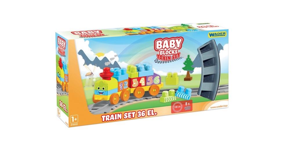 Zestaw odcinków imitujących tory kolejowe o długości 2,24 m, oraz zestaw klocków służących do zbudowania kolejki w atrakcyjnych żywych kolorach.