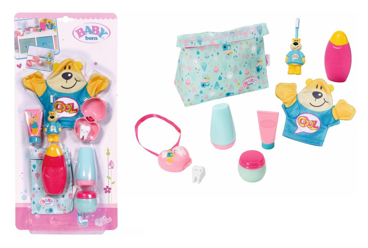 BABY born - Zestaw akcesoriów toaletowych dla lalki 827116. Czy mycie może być świetną zabawą? Oczywiście! Z takim zestawem akcesoriów do higieny możesz bawić się swoją lalą w wodzie lub odgrywać scenki, nawiązujące do kąpieli bobasa. Zestaw zawiera jasnoniebieską kosmetyczkę w pastelowe wzory, 3 pojemniczki - imitujące kosmetyki: krem, żel do kąpieli i balsam, pastę do zębów z motywem postaci misia, a także zabawną szczoteczkę do zębów w kształcie figurki miśka. Baby born to rezolutna, mała dziewczynka, która traci już mleczaki, dlatego do zestawu dołączono śliczny pojemniczek w kształcie serduszka z mlecznym ząbkiem. Gdy lala będzie wymagała kąpieli, na pewno chętnie podda się wodnym zabiegom z turkusowo - miodową myjką - misiem Bruno.