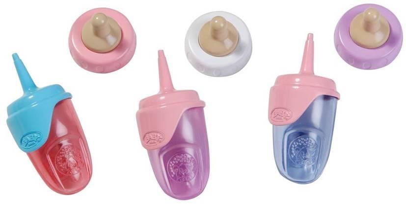 Kolorowa buteleczka da lalek Baby born posiada dwie, wymienne końcówki, które pozwalają na użycie jej dla wszystkich laleczek Baby born. W zestawie znajduje się także nakrętka, zabezpieczająca przed wylaniem wody.