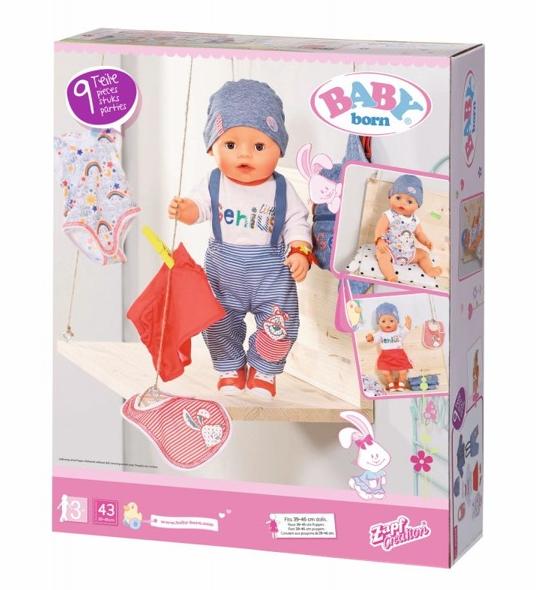 Zestaw zawiera aż 9 elementów garderoby dla laleczki Baby born. Z pewnością ""mała mama"" znajdzie idealny strój na każdą okazję. Spodenki w paski z szelkami i elegancką białą bluzą, a może sportowa spódniczka i modna kurteczka świetnie sprawdzą się podczas spaceru lub wyjścia do parku. Podczas chłodniejszych dni możesz założyć lalce czapeczkę by było jej cieplutko. Pamiętaj także o trampkach. Kolorowe body natomiast idealnie sprawdza się podczas relaksu lub zabawy w domu. Body zapewnią pełną wygodę Baby Born. Gdy przyjdzie pora na obiadek pamiętaj by założyć nowy śliniaczek. Lalka Baby born lubi modnie wyglądać dlatego w zestawie znajdziesz także kolorową bransoletkę dopełniającą każdą stylizację. Ubranka przeznaczone dla lalek 39 - 46 cm. Zestaw nie zawiera lalki.