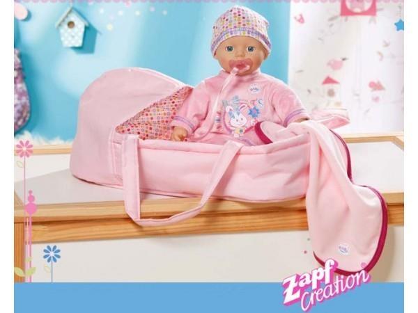 My little baby born to propozycja laleczki dlamniejszych dziewczynek już od 1 roku życia.Niezwykle mięciutki brzuszek sprawia, że lalę miło sięprzytula, a niewielki rozmiar i waga sprawiają, że ""małemamusie"" będą mogły bez trudu przenosić swoją lalę.Śliczna buźka i niebieskie oczka zauroczą każdego!Lalka ubrana jest w różowe ubranko z ładnąaplikacją i kolorową czapeczkę.Do zestawu dołączono smoczek, kocyk i nosidełko -łóżeczko, by dziewczynki mogły zabrać ukochanąlalę na spacer lub uśpić w wygodnym posłaniu.Wymiary opakowania: 35 x 25 x 16 cmWymiary lalki: 32cm