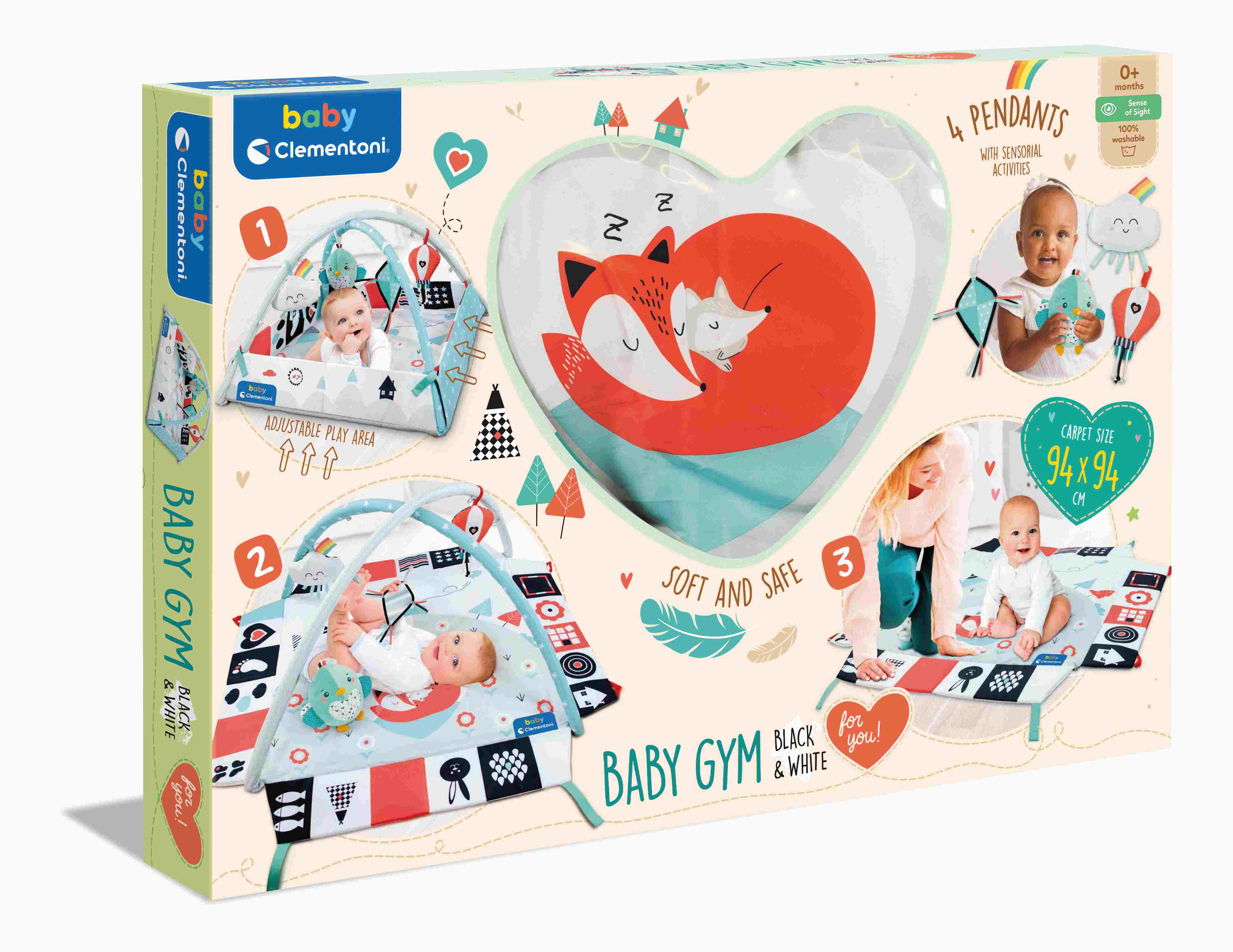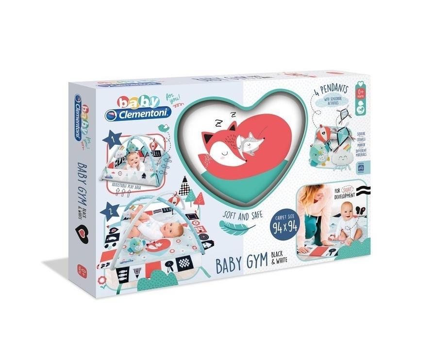 Mięciutka mata gimnastyczna z różnorodnymi akcesoriami do zabawy.