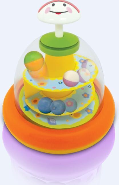 Bączek z kolorowymi kuleczkami. Zabawkę bardzo łatwo wprawić w ruch. Wystarczy wcisnąć przycisk w kształcie biedronki, aby uruchomić wirujące piłeczki i usłyszeć łagodne melodie. Zabawka wpłynie na rozwój motoryki oraz percepcji dziecka. Bączek na pewno stanie się towarzyszem kreatywnych zabaw. Zabawka przeznaczona dla dzieci od 6 m
