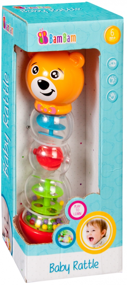 Grzechotka MIŚ to zabawka przeznaczone dla niemowląt od 6 miesiąca życia. Kolorowa spirala z kuleczkami zapewnia efekty wizualne poruszającej się tęczy kolorowych kulek, dynamikę, a przy tym efekty dźwiękowe. Zabawka wykonana z wysokiej jakości plastiku, zachęca malucha do zabawy, a jednocześnie stymuluje rozwój jego zmysłów wzroku, słuchu oraz zdolności motorycznych. Zabawka wykonana z najwyższej jakości materiałów, zgodnie z europejska normą EN 71, nie zawierających ftalanów.