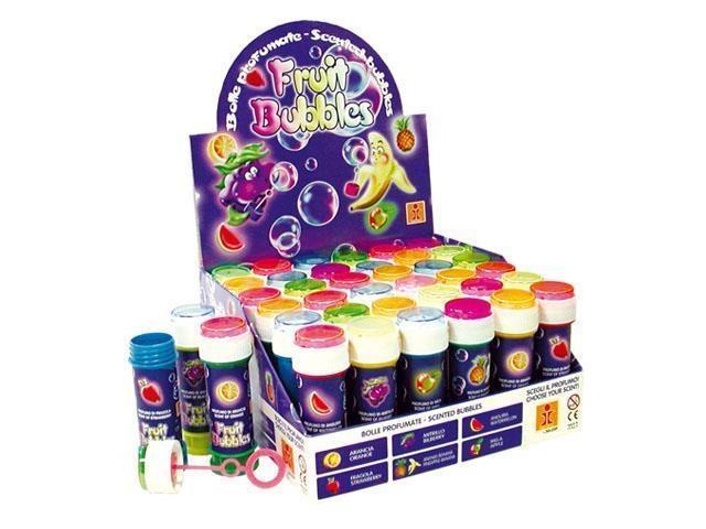 Bańki mydlane 60 ml Owocowe: pomarańczowe, truskawkowe, melonowe, ananasowo-bananowe, jabłkowe, jagodowe Bańki mydlane pozytywnie przeszły testy pod kątem zawartości substancji szkodliwych, nie wywołują alergii u dzieci.