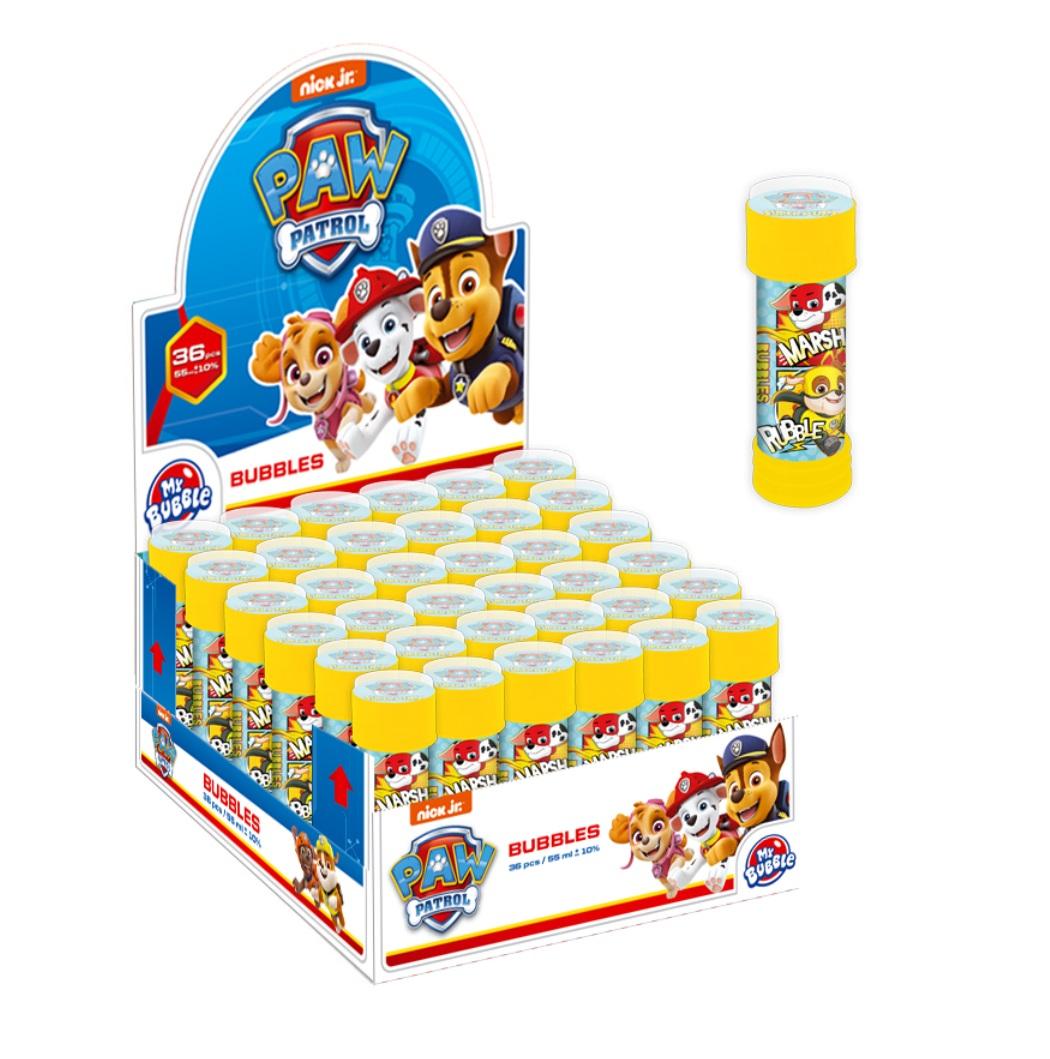 Bańki mydlane z licencją Psi Patrol od My Bubble ucieszą nie tylko bawiące się dziecko ale i wszystkich wokół. Idealne również do wykorzystywania podczas różnego rodzaju imprez plenerowych, przyjęć urodzinowych czy festynów! Pojemniczki wypełnione są specjalnym płynem do robienia baniek. Należy zamoczyć końcówkę w gotowym płynie, a po wyjęciu podmuchać. Każdy pojemniczek na zakrętce posiada gierkę labirynt z kulką. Bańki o pojemności 55 ml. Wykonany z plastiku. Przeznaczony dla dzieci w wieku: 3+.Pakowane w displayu po 36 szt. Długość: 11 cm. Wymiary opakowania zbiorczego (dł. x wys. x gł.) [cm] 23x12x23.