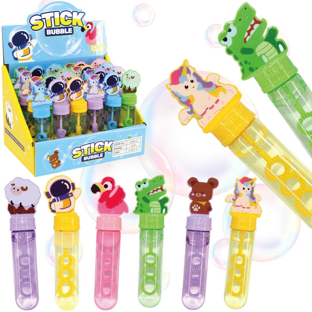 Bańki Mydlane "STICK BUBBLE" - Wesołe Zwierzątka i Astronauta! Przedstawiamy urocze bańki mydlane z patyczkami do baniek mydlanych z serii "STICK BUBBLE", które zamienią każdą zabawę w prawdziwe bąbelkowe szaleństwo! Te kolorowe tuby z figurkami na szczycie to idealny sposób na wywołanie uśmiechu i zachęcenie do zabawy na świeżym powietrzu. Cechy produktu: Sześć Uroczych Motywów: Każdy patyczek jest zakończony inną, uroczą figurką zwierzątka lub postaci, co sprawia, że dzieci chętnie je kolekcjonują. Dostępne motywy to: o Owieczka o Astronauta o Flaming o Krokodyl o Miś o Jednorożec Łatwe w Użyciu: Wystarczy zanurzyć końcówkę patyczka w płynie i dmuchnąć, aby stworzyć mnóstwo pięknych baniek mydlanych. Idealne dla małych rączek. Kolorowe Tuby: Patyczki dostępne są w różnych, jaskrawych kolorach (fioletowy, żółty, różowy, zielony), co dodaje im atrakcyjności wizualnej. W zestawie Płyn do Baniek: Każda tuba jest wypełniona specjalnym płynem do baniek mydlanych, dzięki czemu zabawka jest gotowa do użycia od razu po wyjęciu z opakowania. Rozwój Dziecka: Zabawa bańkami mydlanymi stymuluje rozwój koordynacji wzrokowo-ruchowej, a także zachęca do aktywności na świeżym powietrzu i interakcji z rówieśnikami. Wygodny Display: Patyczki są sprzedawane w zbiorczym display'u (24 sztuki, jak wskazuje opakowanie "24 PCS"), co ułatwia ich ekspozycję w sklepie. Wiek: Produkt przeznaczony dla dzieci w wieku 3 lat i starszych (zgodnie z oznaczeniem "3+" na opakowaniu zbiorczym). Wielkość pojedynczego opakowania baniek: 14cm Idealne na: Urodziny i imprezy plenerowe. Pikniki i wypady do parku. Zabawę w ogrodzie lub na balkonie. Drobny upominek, nagrodę czy gadżet na Dzień Dziecka.