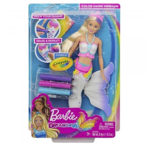 Barbie Dreamtopia Syrenka kolorowa magia ma w zestawie zmywalne pisaki Crayola, które mogą zostać użyte do ozdobienia gorsetu, ogona i płetwy lalki – tyle razy, ile chcesz!