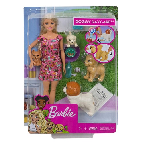 Dwa większe psy z pewnością zachowają swój ruch: jeden z nich może siusiać, a drugi robić kupkę! Miłośnicy małych zwierząt będą się dobrze bawić bawiąc się z lalką Barbie i zestawem do zabawy Doggy Daycare.