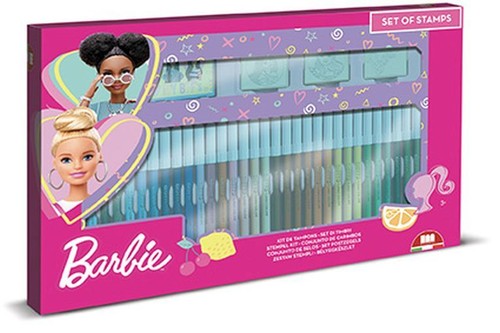 W skład zestawu wchodzą: 3 drewniano-gumowe pieczątki, 1 poduszeczka do tuszu, 36 pisaków oraz książeczka z aktywnościami.