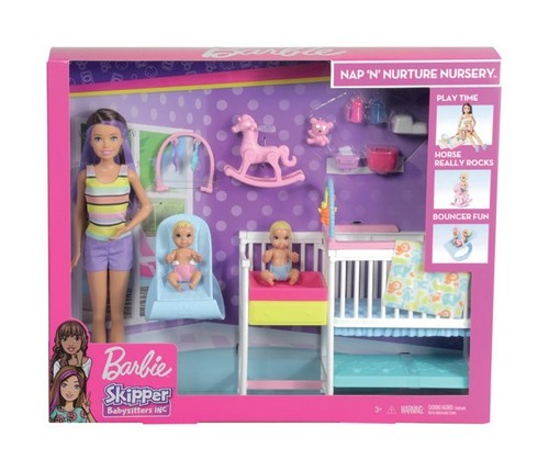 Lalki i zabawki z linii Barbie® Klub Opiekunek pozwalają dzieciom rozwijać zmysł opiekuńczości. Wciel się w rolę niani i pomóż Skipper™ w opiece nad dwoma uroczymi niemowlakami. Aż 15 elementów, w tym łóżeczko z przewijakiem, pozwala opowiadać różnorodne historyjki. Dzieci mogą ćwiczyć karmienie, przewijanie i zabawę z dwiema lalkami bliźniakami oraz akcesoriami zainspirowanymi klasycznymi produktami Fisher-Price®. W zestawie znajdują się: lalka opiekunka Skipper™ w ubranku, dwie lalki dzieci w materiałowych pieluszkach, łóżeczko z przewijakiem, karuzelka do łóżeczka / przyrząd gimnastyczny, konik na biegunach, bujaczek,