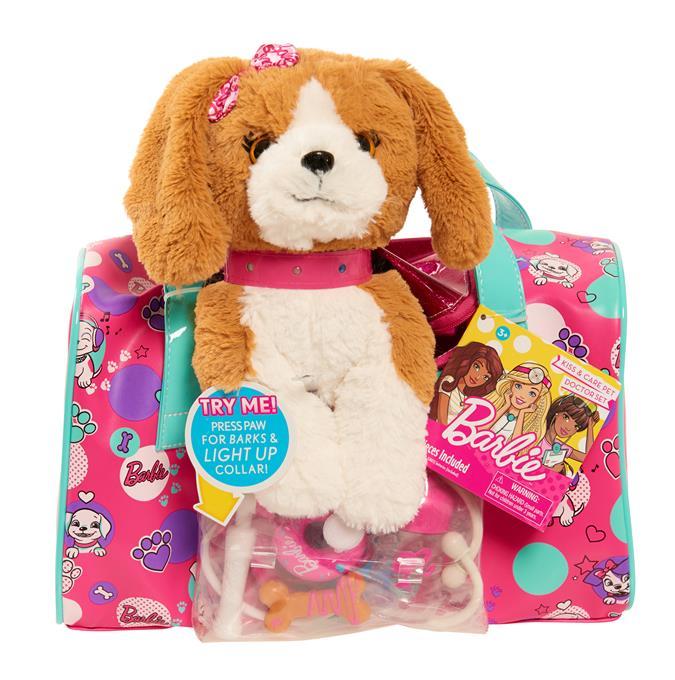 Pomóż swojemu szczeniaczkowi poczuć się lepiej z zestawem weterynarz - Barbie Kiss and Care Pet Doctor. Interaktywny szczeniaczek posiada punkty do przyciskania na łapce i mordce aktywujące rozmaite dźwięki i światełka. Zestaw weterynaryjny zawiera wszystko czego potrzeba by wyleczyć puchatego przyjaciela od bandaży do kości. Wybierz jednego ze szczeniaczków z jasną sierścią i fioletową torbą lub brązową sierścią i różową torbą. Wiek: od 3 lat.