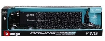 Zestaw Mercedes-AMG Petronas F1 + Mercedes-Benz Actros GigaSpace 1:43 to wyjątkowa propozycja dla fanów Formuły 1 i kolekcjonerów modeli samochodów. W zestawie znajduje się ciężarówka transportowa w barwach zespołu Mercedes-AMG Petronas Formula One Team oraz bolid wyścigowy z numerem kierowcy George`a Russella (63).