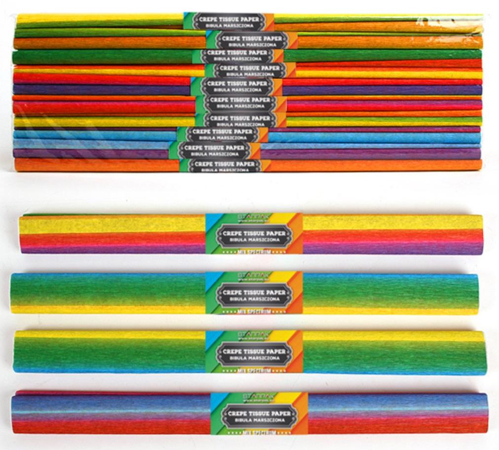 Bibuła marszczona w kolorach tęczy - niezbędna każdemu uczniowi na zajęciach plastycznych.